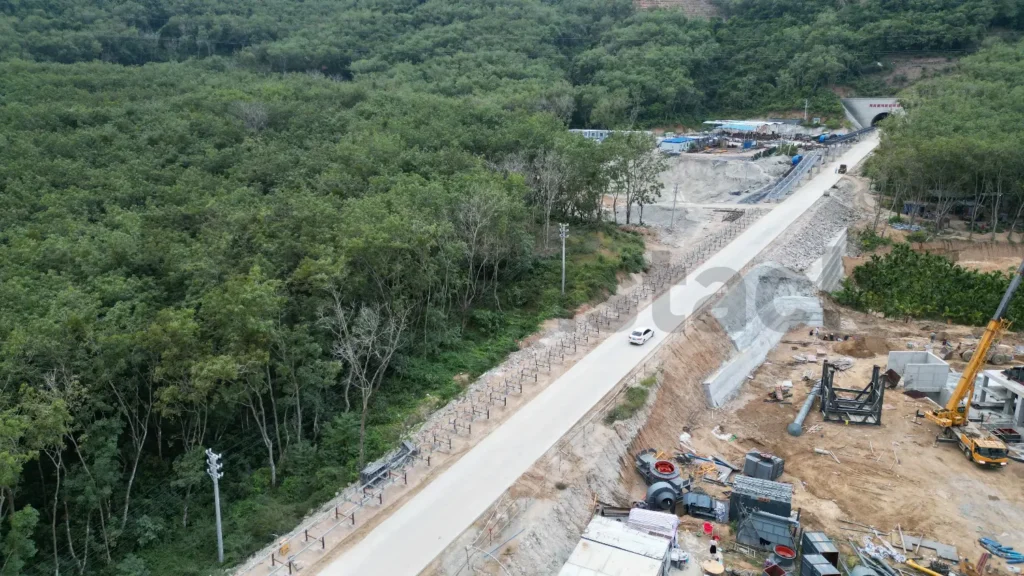 为实现线路优化与地形适应,项目沿线特别开凿了一条全长800米的隧道,用于皮带机系统的穿山铺设,有效减少对地表环境的影响,提高了物料运输的连续性和安全性。