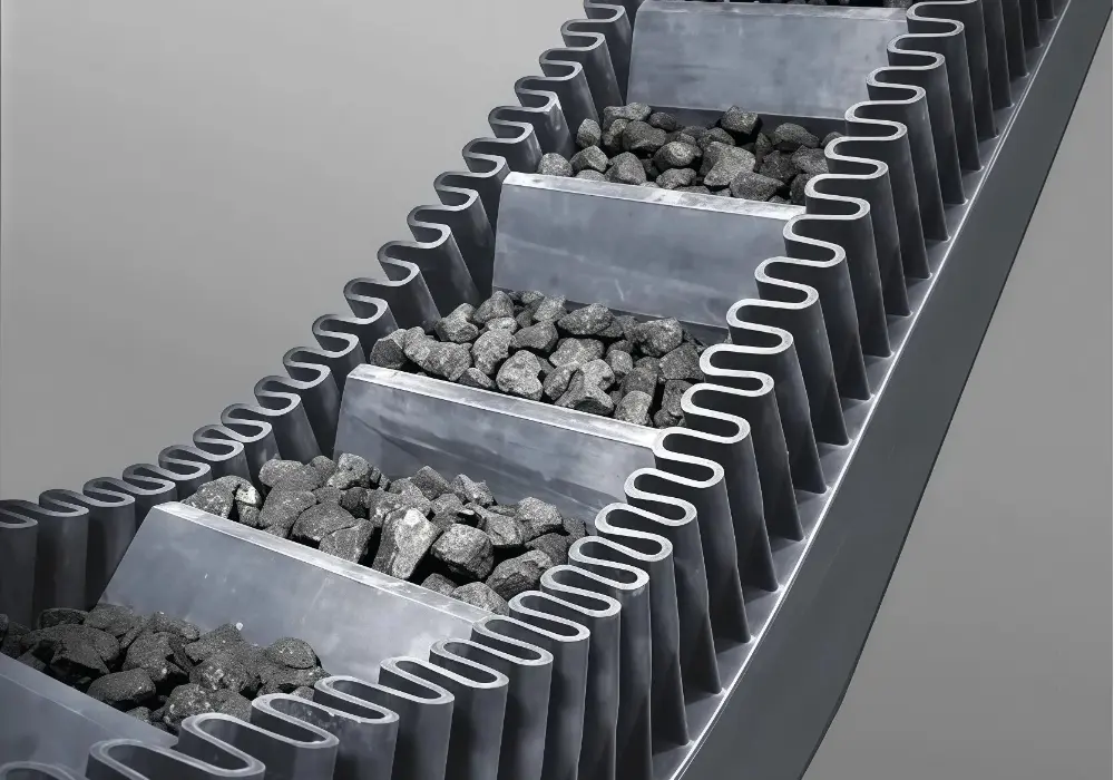 波状挡边带式输送机,俗称挡边机或裙边隔板机,是一种通过在输送带基带上硫化固定的波状挡边和横隔板,形成一个一个“匣形容器”,从而实现大倾角乃至垂直(90°)输送散状物料的设备。