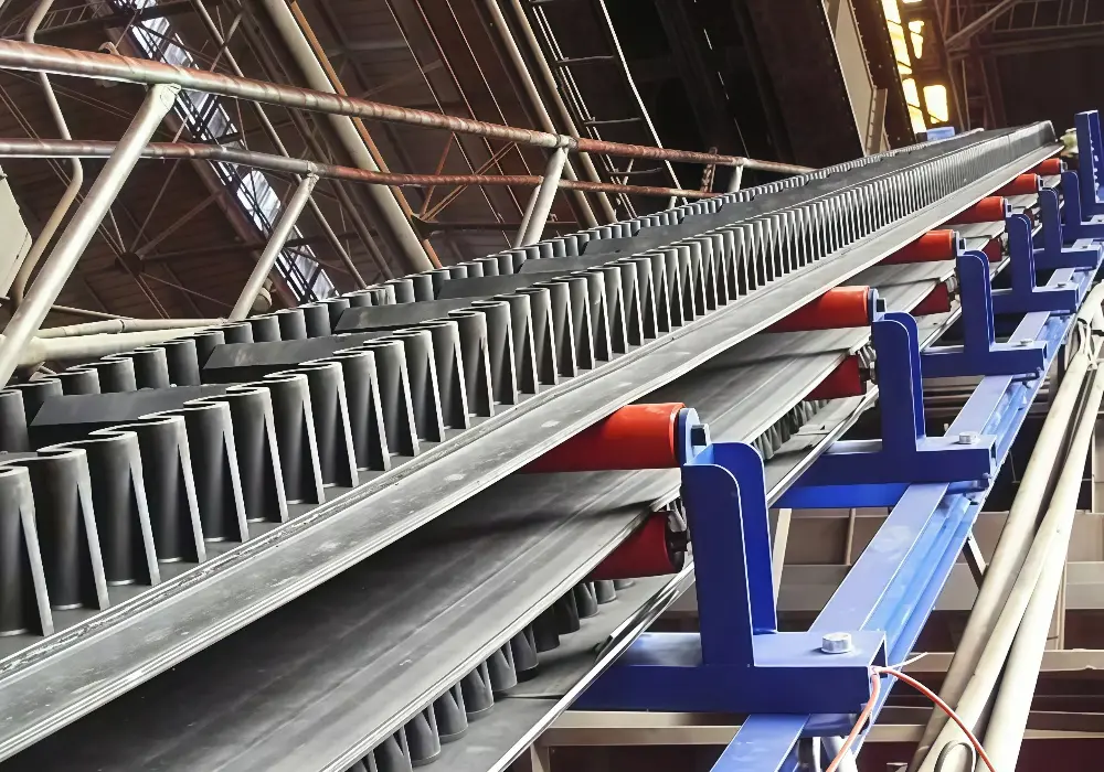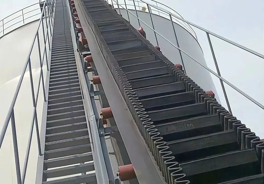 大倾角带式输送机是一种特殊的连续输送设备,利用特制的输送带(带横隔板、花纹或挡边等)与物料之间的摩擦力,以及挡边、横隔板对物料的阻挡作用,共同实现物料大倾角或垂直提升(通常为30°-90°)的输送机械。解决在空间有限、地形复杂的工况下,实现物料高效、短距离、大落差提升或下降的难题。