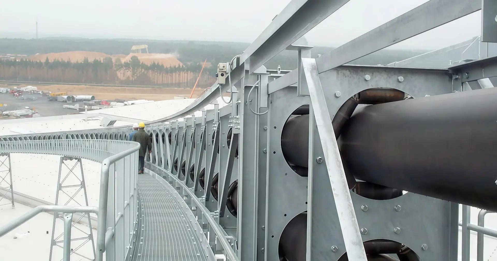 密闭输送段:进入正式管状段,输送带被六边形(或四边形、八边形)布置的托辊组完全卷成圆形管状,将物料密闭其中。
